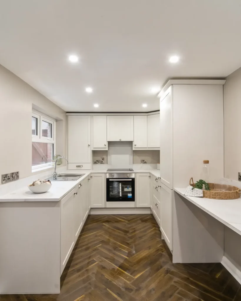 - Herringbone style laminate wood effect flooring supplied and fitted to ground floor